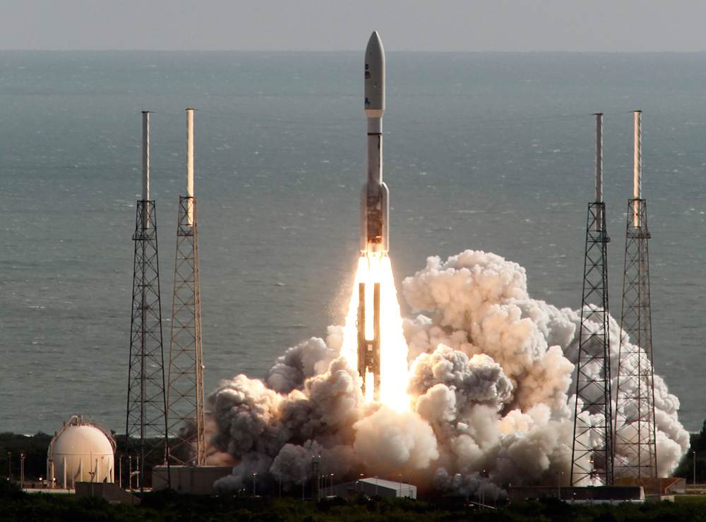 [photo, above: MSL's descent stage, which files the rover down to Mars' surface using eight rockets, and lowers it on a tether for landing. The orange spheres are propellant tanks.]